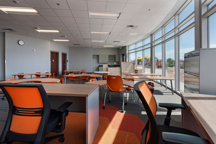 We organized the campus in a radial layout, oriented around a central plaza—an intentional echo of traditional Hogan configurations. Classrooms are designed with large south-facing windows and shaded outdoor learning patios, allowing light and shadow to become active participants in the learning environment.